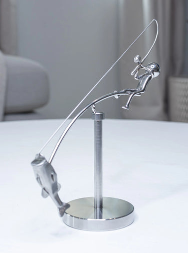Er du træt af at stirre på stillestående og kedelig pynt? Med Den Balancerende Fisker bringer du sjov, natur og bevægelse direkte ind i hjemmet eller på kontoret. Se fiskeren vippe sin stang frem og tilbage, mens gedden i rustfrit stål desperat forsøger at slippe fri – et hypnotiserende kunstværk, der kombinerer afslapning med humor.